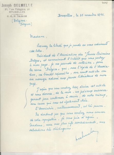[Carta] 1946 nov. 25, Bruxelles, Belgique [a] [Gabriela Mistral] [manuscrito] Joseph Delmelle.