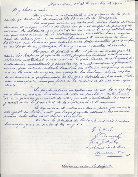 [Carta] 1952 nov. 14, Bruselas, [Belgica] [a] Gabriela Mistral [manuscrito] G. Dierick.