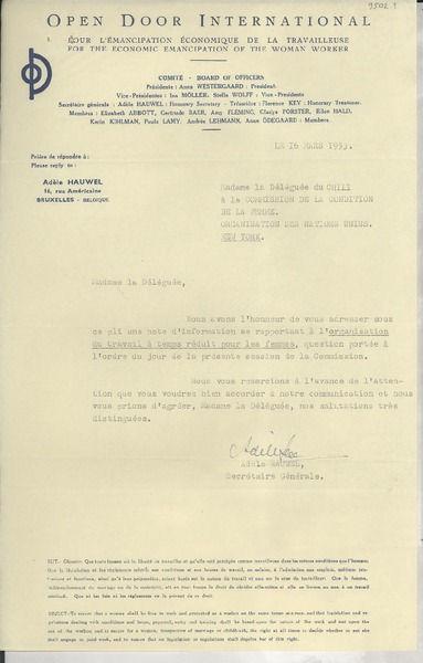 [Carta] 1953 mars 16, Bruxelles, Belgique [a] Gabriela Mistral, New York [manuscrito] Adèle Hauwel.