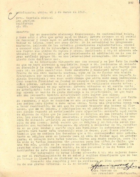 [Carta] 1948 mar. 3, Antofagasta, Chile [a] Gabriela Mistral, Los Angeles, California, EE.UU. [manuscrito] Francisco Vos Dierckx.