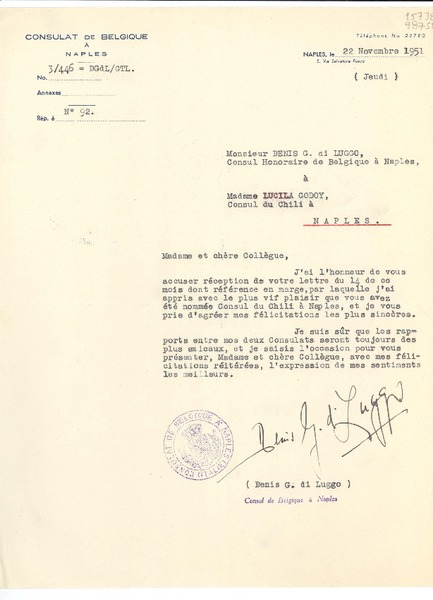 [Carta] 1951 nov. 22, Naples, Italie [a] Madame Lucila Godoy, Consul du Chili à Naples, Italie [manuscrito] Denis G. di Luggo, Consul Honoraire de Belgique à Naples.