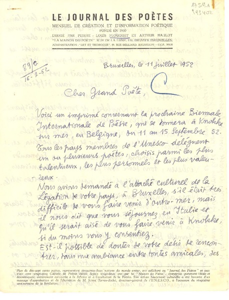 [Carta] 1952 juil. 11, Bruxelles, [Belgique] [a] Cher grand poète [manuscrito] [Pierre Louis] Flouquet.