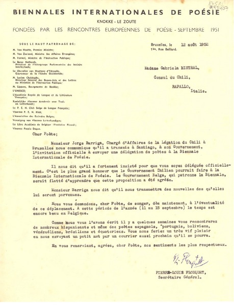 [Carta] 1952 août 12, Bruxelles, [Belgique] [a] Madame Gabriela Mistral, Consul du Chili, Rapallo, Italie [manuscrito] Pierre-Louis Flouquet.