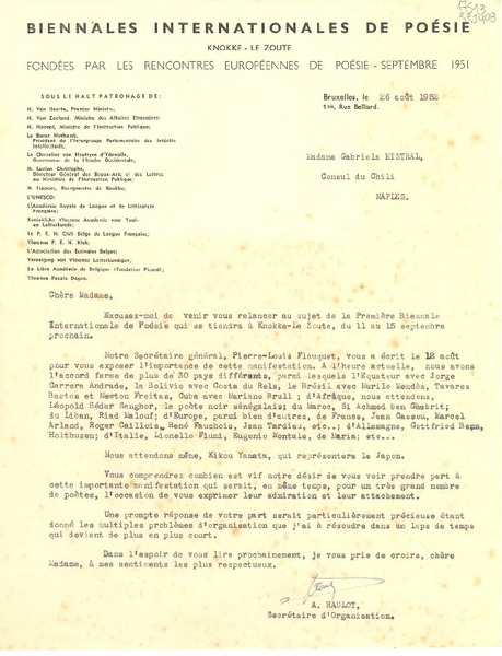 [Carta] 1952 août 26, Bruxelles, [Belgique] [a] Madame Gabriela Mistral, Consul du Chili, Naples, [Italie] [manuscrito] [Arthur] Haulot, Secrétaire d'Organisation.