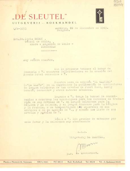 [Carta] 1945 dic. 20, Amberes, Bélgica [a] Lucila Godoy, Cónsul de Chile, Stockholm [manuscrito] Editorial De Sleutel.