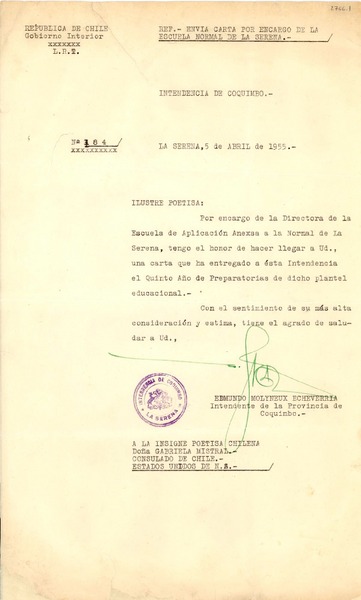 [Carta] 1955 abr. 5, La Serena [a] Gabriela Mistral [manuscrito] Edmundo Molyneux Echeverría.