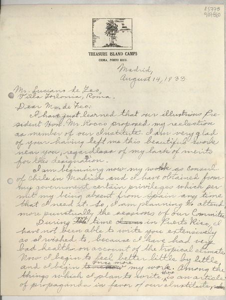 [Carta] 1933 Aug. 14, Madrid, [España] [a] Mr. Luciano De Feo, Villa Torlonia, Roma, [Italia] [manuscrito] [Gabriela Mistral].