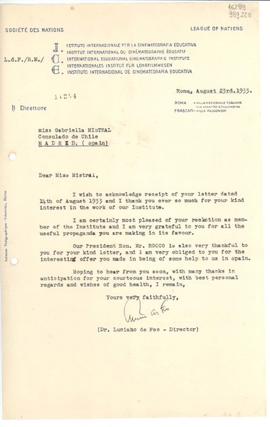 [Carta] 1933 Aug. 23, Roma, [Italia] [a] Miss Gabriella Mistral, Consulado de Chile, Madrid [manuscrito] Dr. Luciano de Feo, Director.