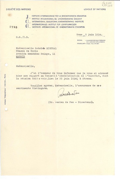 [Carta] 1934 juin 9, Rome, [Italie] [a la] Mademoiselle Gabriela Mistral, Cónsul de Chile, Avenida Menéndex Pelayo, 11, Madrid, [Espagne] [manuscrito] Lucien de Feo, Directeur.