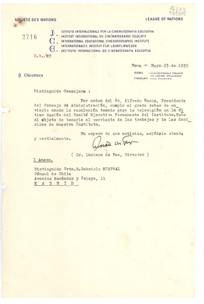[Carta] 1935 mayo 23, Roma, [Italia] [a la] Distinguida Srta. D. Gabriela Mistral, Cónsul de Chile, Avenida Menéndex y Pelayo, 11, Madrid, [España] [manuscrito] Luciano de Feo, Director.