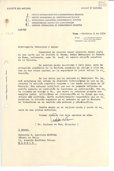 [Carta] 1934 oct. 3, Roma, [Italia] [a] Señorita Gabriela Mistral, Cónsul de Chile, Madrid [manuscrito] Dr. Luciano de Feo, Director.