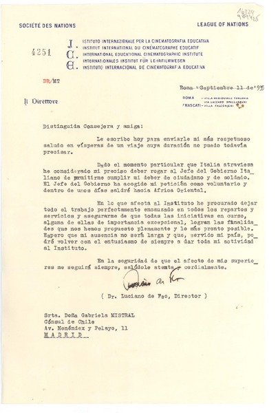 [Carta] 1935 sept. 11, Roma, [Italia] [a la] Srta. Doña Gabriela Mistral, Cónsul de Chile, Av. Menéndex y Pelayo, 11, Madrid, [España] [manuscrito] Luciano de Feo, Director.