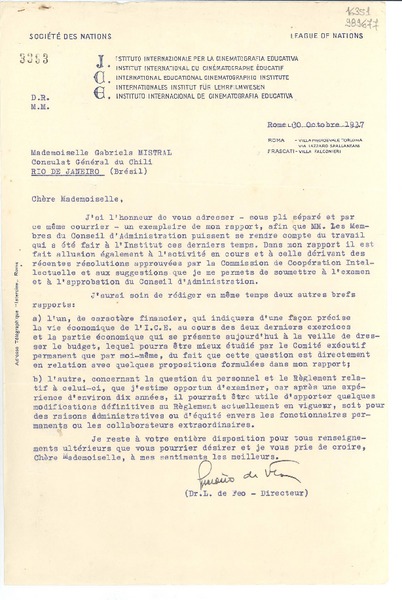 [Carta] 1937 août 5, Rome, [Italia] [a] Mademoiselle Gabrielle Mistral, Consulat Général du Chili, Río de Janeiro [manuscrito] Dr. Luciano de Feo, Director.