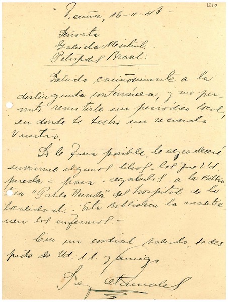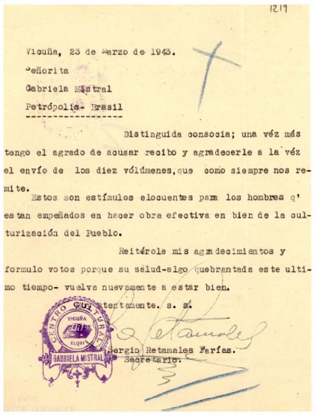 [Carta] 1943 mar. 13, Vicuña, [Chile] [a] Gabriela Mistral, Petrópolis [manuscrito] Sergio Retamales Farias.