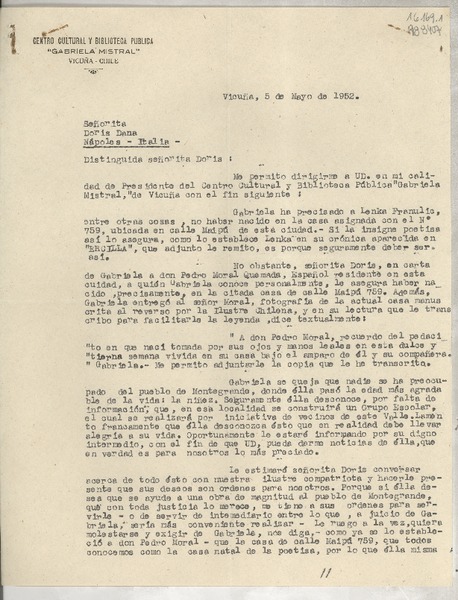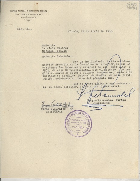 [Carta] 1952 abr. 29, Vicuña, Chile [a la] Señorita Doris Dana, Nápoles, Italia [manuscrito] Sergio Retamales Farías, Presidente.