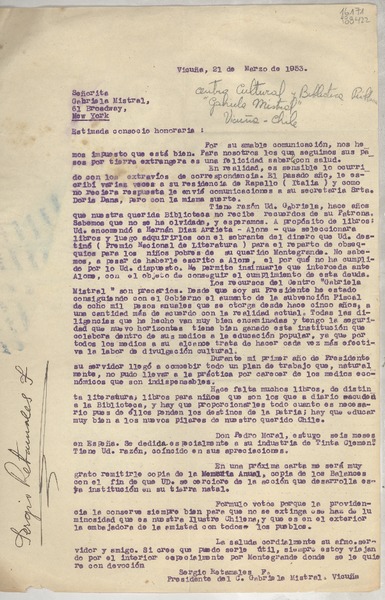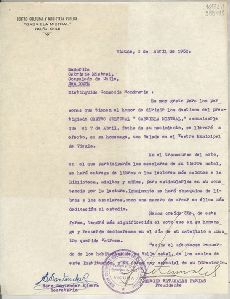 [Carta] 1953 mar. 21, Vicuña, Chile [a la] Señorita Gabriela Mistral, 61 Broadway, New York, [EE.UU.] [manuscrito] Sergio Retamales Farías, Presidente del C. Gabriela Mistral.