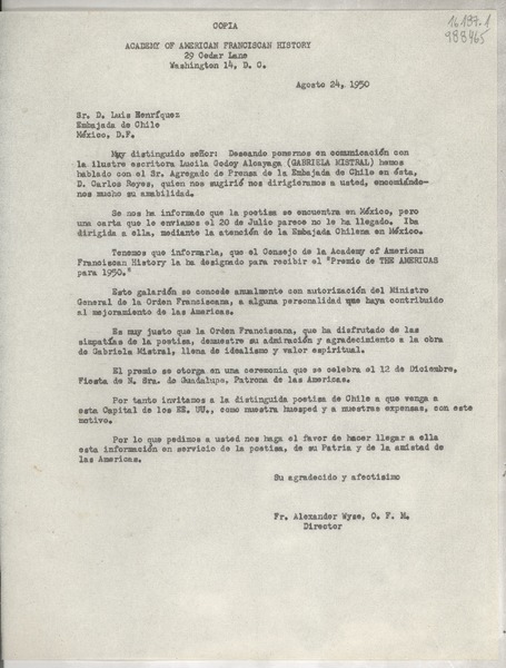 [Carta] 1950 ago. 24, Academy of American Franciscan History, 29 Cedar Lane, Washington 14, D. C., [EE.UU.] [al] Sr. D. Luis Henríquez, Embajada de Chile, México, D. F. [manuscrito] Fr. Alexander Wyse, O. F. M., Director.