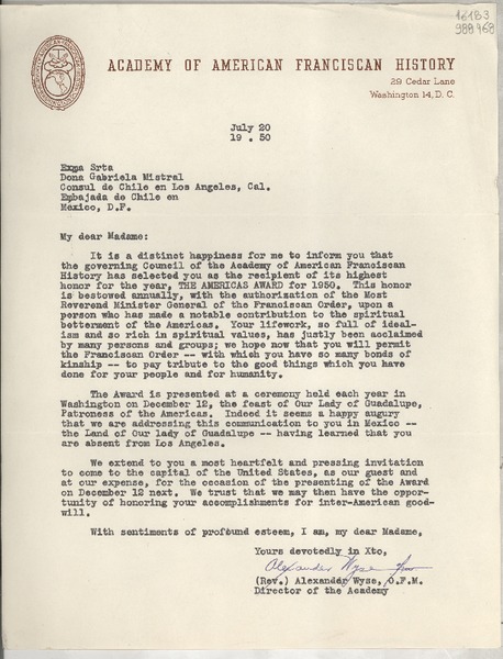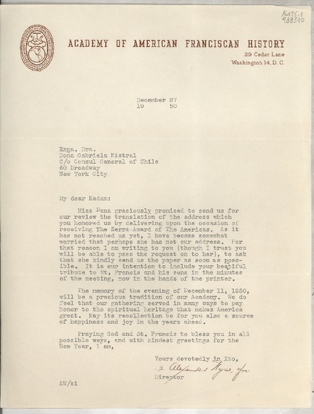 [Carta] 1950 Dec. 27, Academy of American Franciscan History, 29 Cedar Lane, Washington 14, D. C., [EE.UU.] [a la] Exma. Dra. Doña Gabriela Mistral, Co Consul General of Chile, 60 Broadway, New York City, [EE.UU.] [manuscrito] / Alexander Wyse, Director.