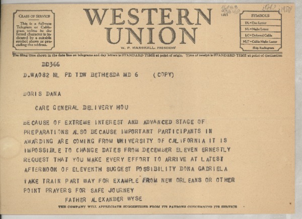 [Telegrama] [1950?], [EE.UU.] [a] Doris Dana, General Delivery, Hou, [EE.UU.] [manuscrito] Father Alexander Wyse.