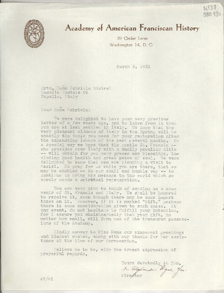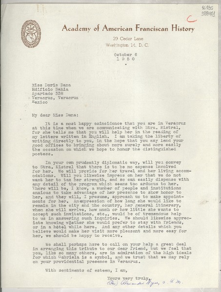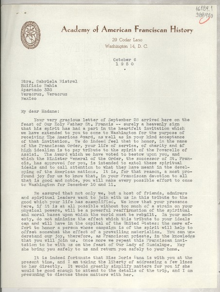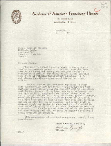 [Carta] 1950 Nov. 17, Academy of American Franciscan History, 29 Cedar Lane, Washington 14, D. C., [EE.UU.] [a la] Stra. [i.e. Srta.] Gabriela Mistral, Edificio Bahia, Apartado 338, Veracruz, Veracruz, México [manuscrito] Alexander Wyse, Director.