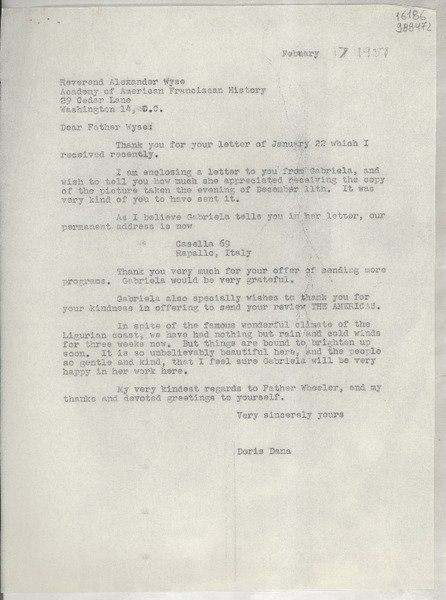 [Carta] 1951 Feb. 17, [Estados Unidos] [a] Reverend Alexander Wyse, Academy of American Franciscan History, Washington [manuscrito] Doris Dana.