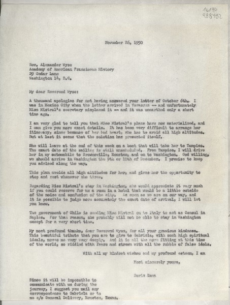 [Carta] 1950 Nov. 26, Mexico City, [México] [al] Rev. Alexander Wyse, Academy of American Franciscan History, 29 Cedar Lane, Washington 14, D. C., [EE.UU.] [manuscrito] Doris Dana.
