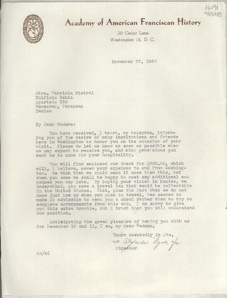 [Carta] 1950 Nov. 27, Academy of American Franciscan History, 29 Cedar Lane, Washington 14, D. C., [EE.UU.] [a la] Stra. [i.e. Srta.] Gabriela Mistral, Edificio Bahia, Apartado 338, Veracruz, Veracruz, México [manuscrito] Alexander Wyse, Director.