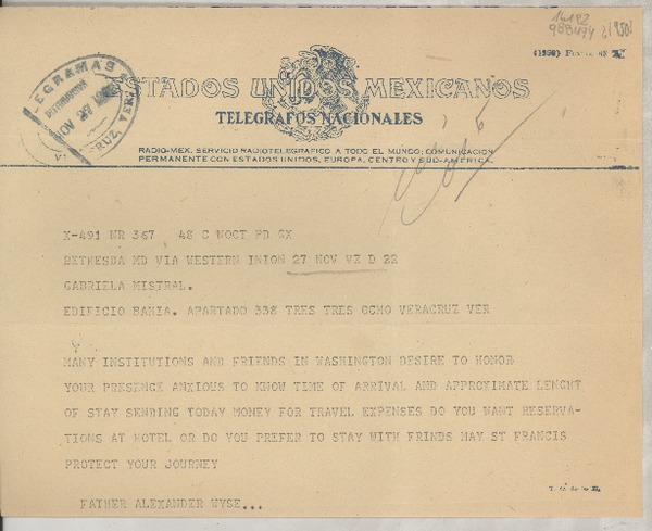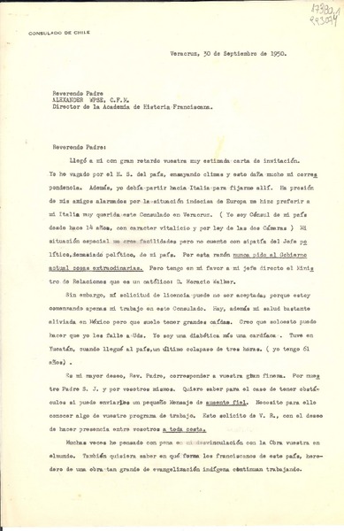 [Carta] 1950 sept. 30, Veracruz, [México] [al] Reverendo Padre, Alexander WPSE [i.e. Wyse], O. F. M., Director de la Academia de Historia Franciscana [manuscrito] Gabriela Mistral.