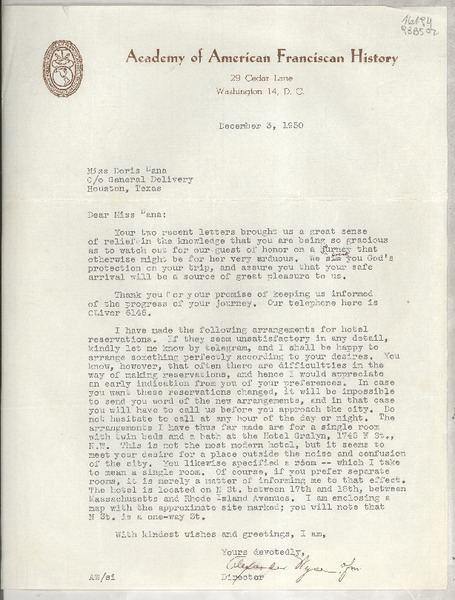 [Carta] 1950 Dec. 3, Academy of American Franciscan History, 29 Cedar Lane, Washington 14, D. C., [EE.UU.] [a] Miss Doris Dana, Co General Delivery, Houston, Texas, [EE.UU.] [manuscrito] / Alexander Wyse, Director.