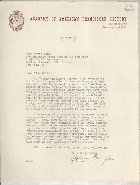 [Carta] 1951 Jan. 22, Academy of American Franciscan History, 29 Cedar Lane, Washington 14, D. C., [EE.UU.] [a] Miss Doris Dana, co Guaranty Trust Company of New York, "Hold Mail" Department, Madison Avenue & 60 th Street, New York, N.Y., [EE.UU.] [manuscrito] / Alexander Wyse, Director.