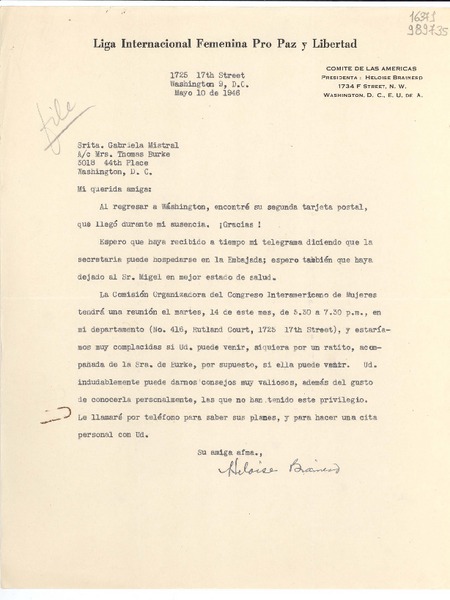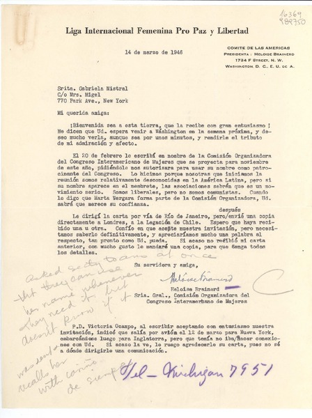 [Carta] 1946 mar. 14, 1734 F Street, N. W., Washington, D. C., [EE.UU.] [a la] Srita. Gabriela Mistral, co Mrs. Migel, 770 Park Ave., New York, [EE.UU.] [manuscrito] / Heloise Brainerd, Sria. Gral., Comisión Organizadora del Congreso Interamericano de Mujeres.