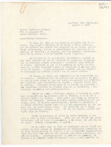 [Carta] 1947 ago. 9, Apartado 226, Guatemala [a] Srita. Gabriela Mistral, 729 E. Anapamu St., Santa Barbara, Calif. [manuscrito] Su amiga que mucho la quiere Heloise.