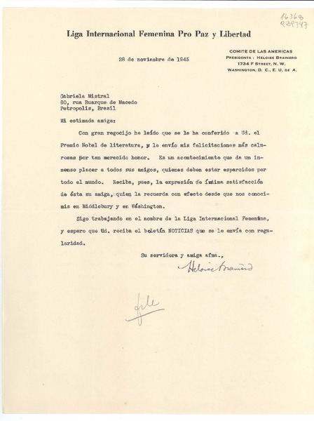 [Carta] 1945 nov. 28, 1734 F Street, N. W., Washington, D. C., [EE.UU.] [a] Gabriela Mistral, 60, rua Buarque de Macedo, Petrópolis, Brazil [manuscrito] Heloise Brainerd.
