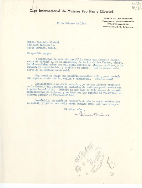 [Carta] 1947 feb. 26, Washington D. C., [Estados Unidos] [a] Srita. Gabriela Mistral, 1305 Buena Vista St., Monrovia, Calif. [manuscrito] Heloise Brainerd.