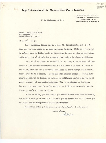 [Carta] 1949 dic. 30, Washington D. C., [Estados Unidos] [a] Srita. Gabriela Mistral, 729 East Anapamu St., Santa Barbara, Calif. [manuscrito] Su amiga afma Heloise Brainerd.