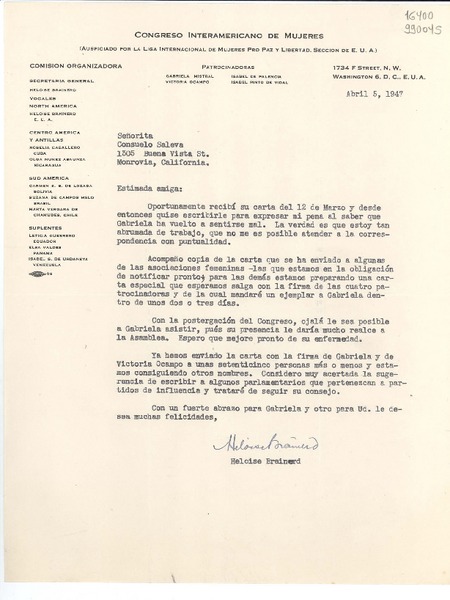 [Carta] 1947 abr. 5, Washington D. C., [Estados Unidos] [a] Señorita Consuelo Saleva, 1305 Buena Vista St., Monrovia, California [manuscrito] Heloise Brainerd.