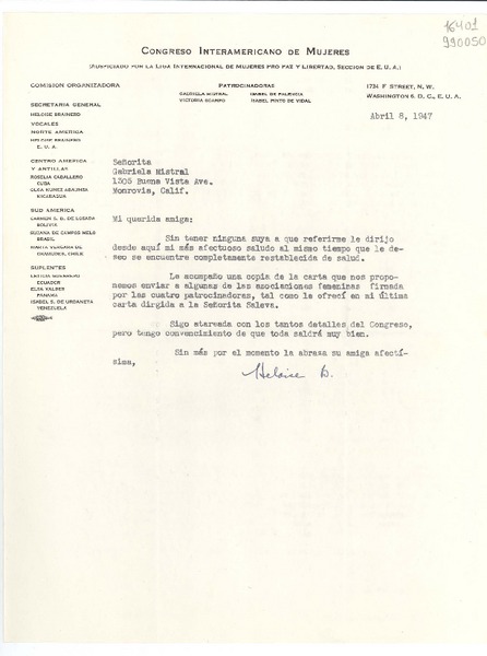 [Carta] 1947 abr. 3, Washington D. C., [Estados Unidos] [a] Distinguida Señora [manuscrito] Heloise Brainerd, Secretaria General.