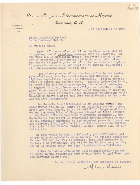 [Carta] 1947 sept. 9, Guatemala [a] Srita. Gabriela Mistral, Santa Barbara, Calif. [manuscrito] Heloise Brainerd.