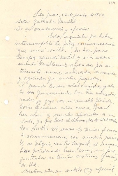 [Carta] 1944 jun. 12, San Juan, Argentina [a] Gabriela Mistral [manuscrito] Carmen Peñaloza Alcayaga de Varese.