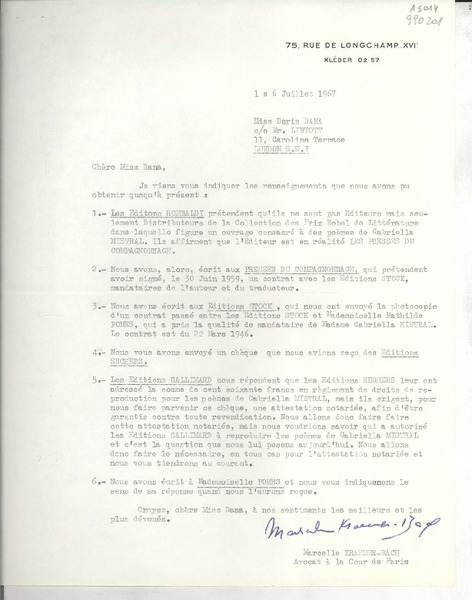 [Carta] 1967 juil. 6, 75, Rue de Longchamp XVI, Kléber 02-57, [Paris], [France] [a] Miss Doris Dana, co Mr. Lintott, 11, Caroline Terrace, London S.W. I, [England] [manuscrito] / Marcelle Kraemer-Bach, Avocat à la Cour de Paris.