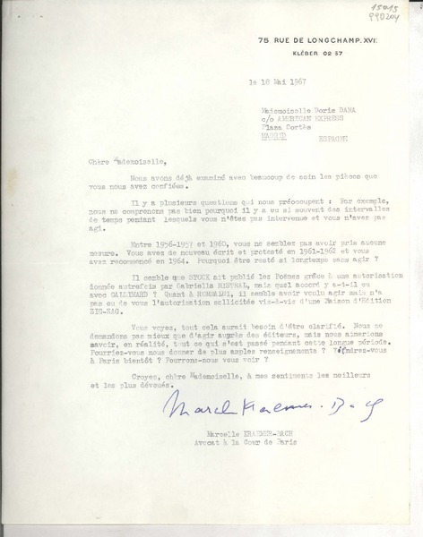 [Carta] 1967 mai 18, 75, Rue de Longchamp XVI, Kléber 02-57, [Paris], [France] [a la] Mademoiselle Doris Dana, co American Express, Plaza Cortés, Madrid, [España] [manuscrito] / Marcelle Kraemer-Bach, Avocat à la Cour de Paris.
