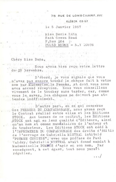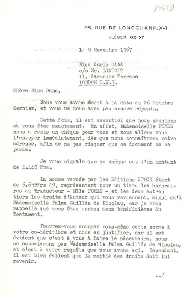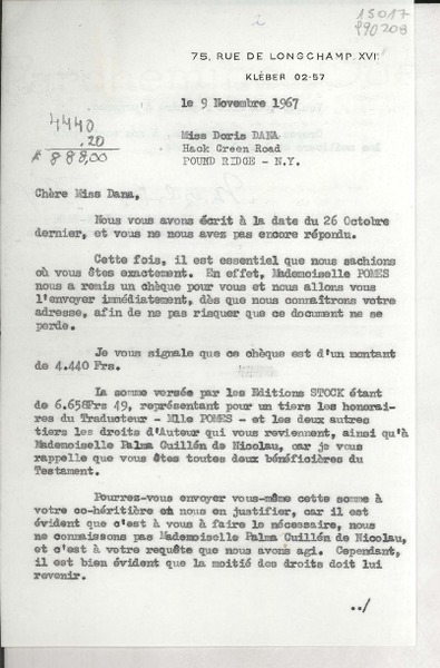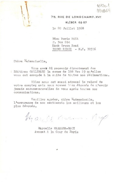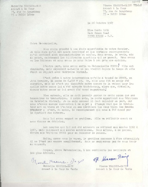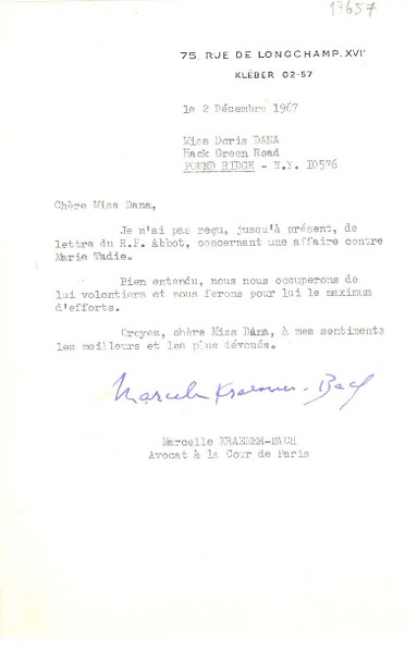 [Carta] 1967 nov. 9, 75, Rue de Longchamp XVI, Kléber 02-57, [Paris], [France] [a] Miss Doris Dana, Hack Green Road, Pound Ridge, N.Y., [EE.UU.] [manuscrito] Marcelle Kraemer-Bach, Avocat à la Cour de Paris.
