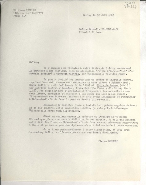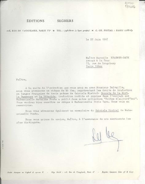 [Carta] 1967 juin 22, 118, Rue de Vaugirard, Paris, [France] [a] Maître Marcelle Kraemer-Bach, Avocat à la Cour, 75, Rue de Longchamp, Paris 16ème, [France] [manuscrito] Éditions Seghers.