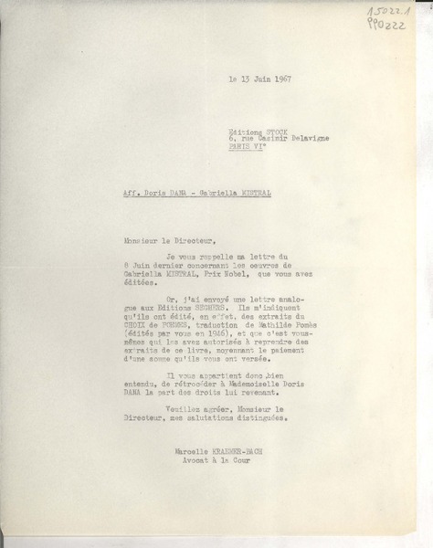 [Carta] 1967 juin 13, [Paris], [France] [a] Editions Stock [y] Gallimard, Paris, [France] [manuscrito] Marcelle Kraemer-Bach, Avocat à la Cour de Paris.
