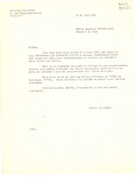 [Carta] 1967 juin 12, Paris, [Francia] [a] Maitre Marcelle Kraemer-Bach [manuscrito] Claude Gallimard.