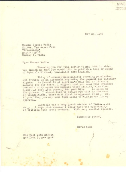 [Carta] 1957 May 24, New York, [Estados Unidos] [a] Madame Sophia Wadia, Editor The Aryan Path, Malabar Hill, Bombay, India [manuscrito] Doris Dana.