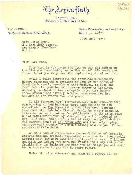 [Carta] 1957 June 19, Bombay, India [a] Miss Doris Dana, 204 East 20th Street, New York [manuscrito] Sophia Wadia.