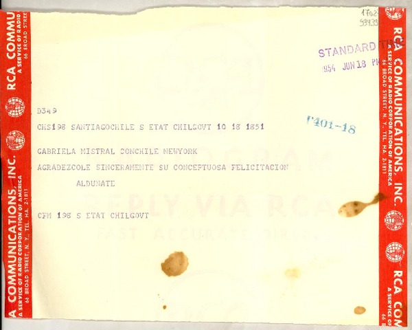 [Telegrama] 1954 aug. 3, [New York, Estados Unidos?] [a] [Roberto] Aldunate, Ministro de Relaciones, Chile [manuscrito] [Gabriela Mistral].