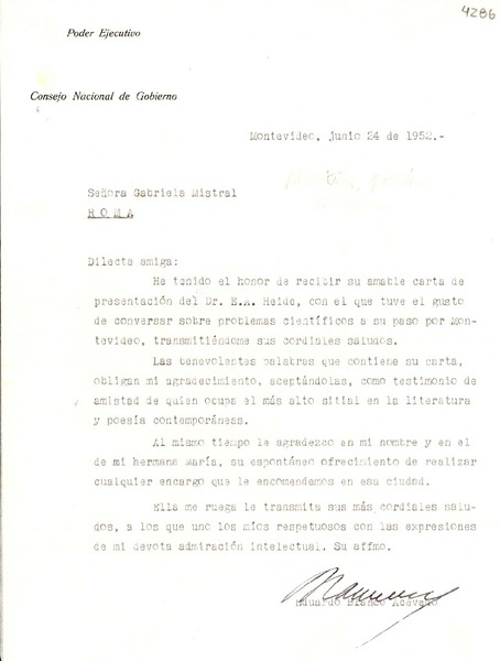 [Carta] 1943 abr. 28, Petrópolis, [Brasil] [al] Doctor Eduardo Blanco Acevedo, Montevideo, Uruguay [manuscrito] Gabriela Mistral.