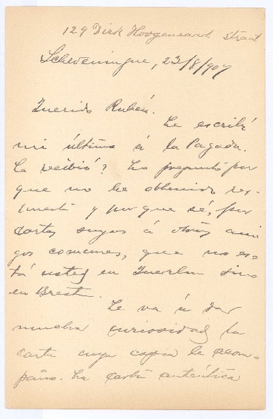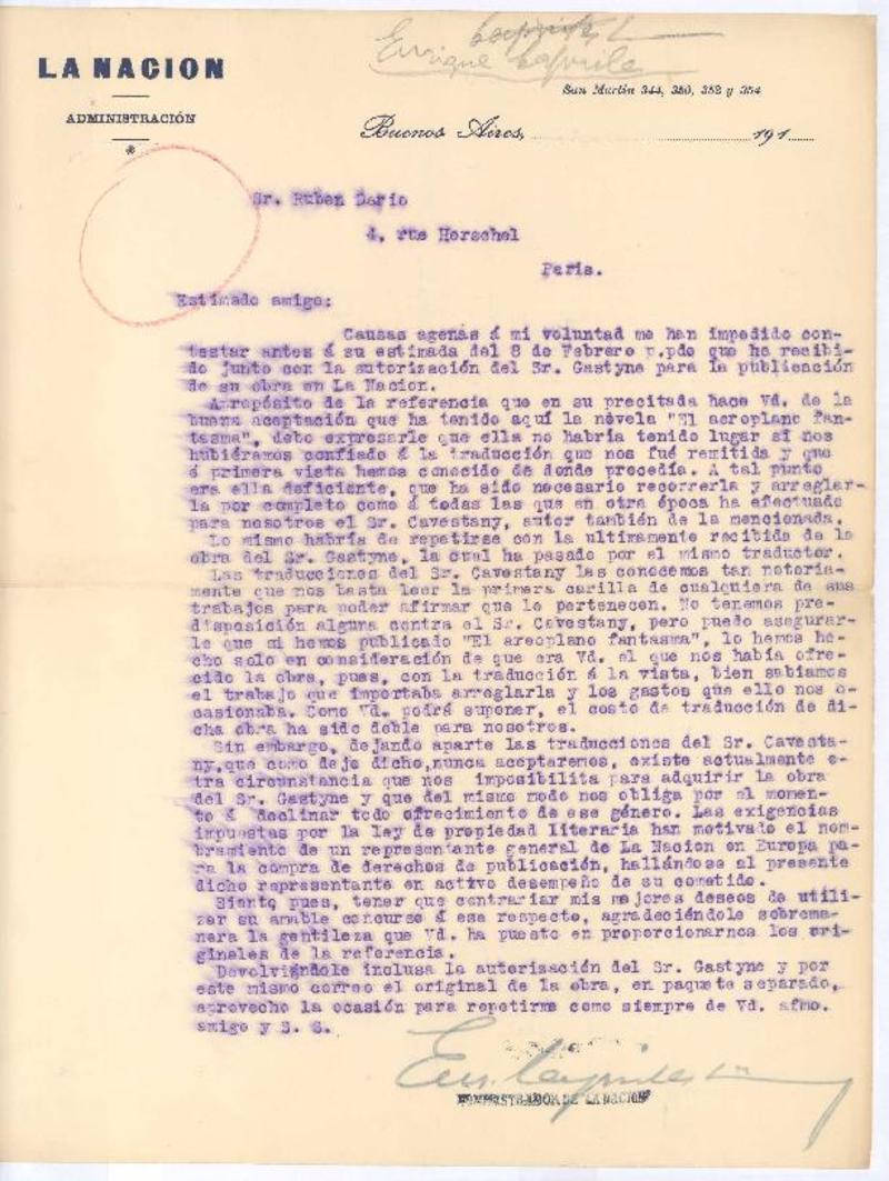 [Carta] [entre 1910 y 1916], Buenos Aires, Argentina [a] Rubén Darío [manuscrito] Enrique Caprile.